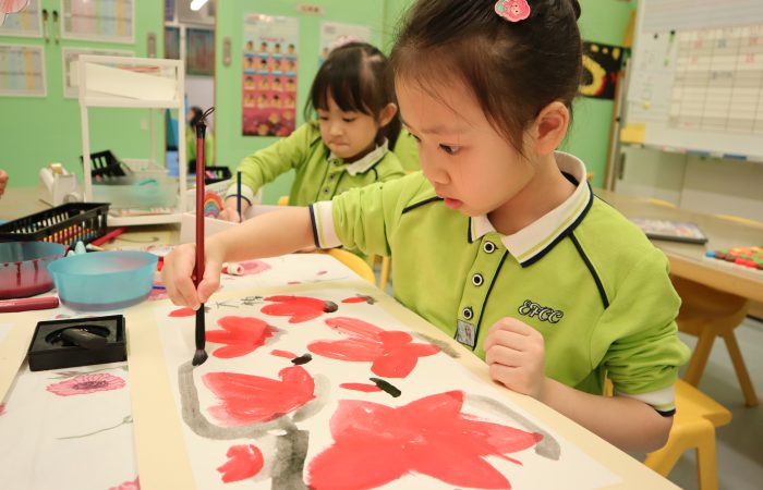 活動簡介:老師向幼兒介紹中國新年的的傳統文化習俗—窗飾剪紙及揮春,以及中國傳統藝術—彩墨畫和青花瓷,並於課室的美藝角放置有關材料,讓幼兒在美藝時間進行創作。