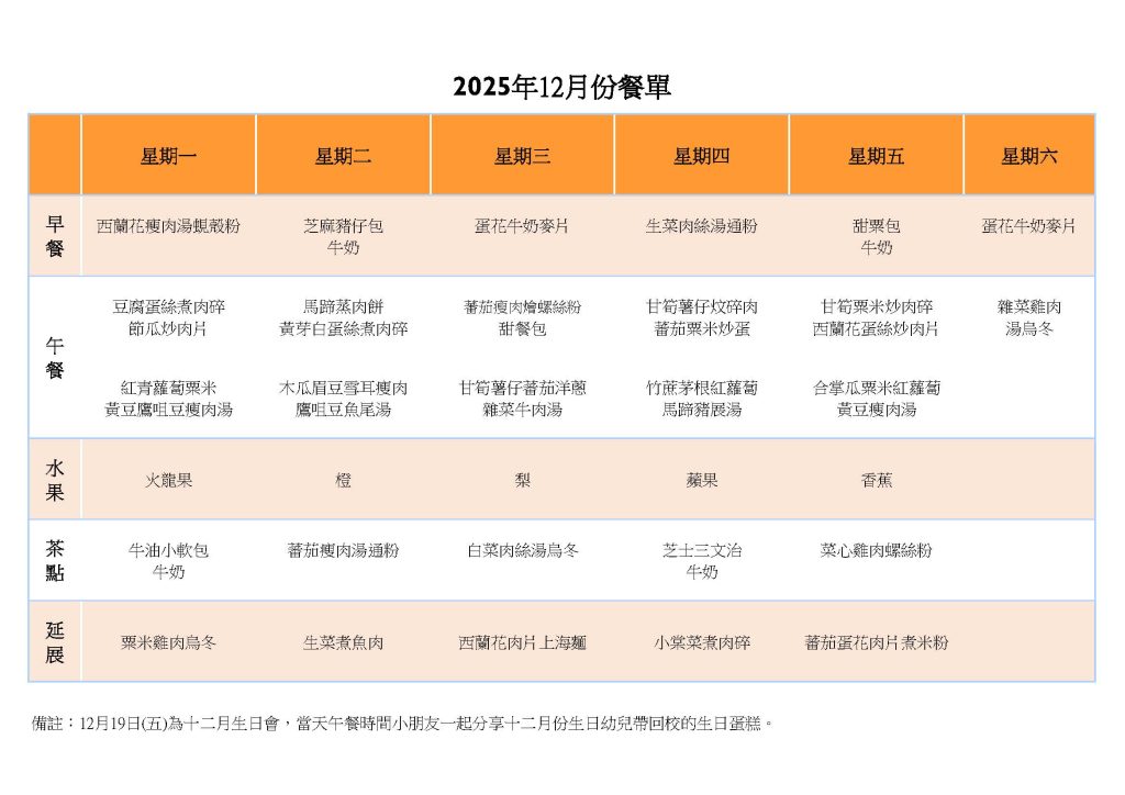 本校餐單以幼兒的營養需要、食物營養價值及衞生為首要考慮因素,並遵從播道醫院註冊營養師及衞生署編製的《二至六歲幼兒營養指引》中提及的飲食建議。同時,鼓勵學生多喝清水,每天自備個人水壺飲水。